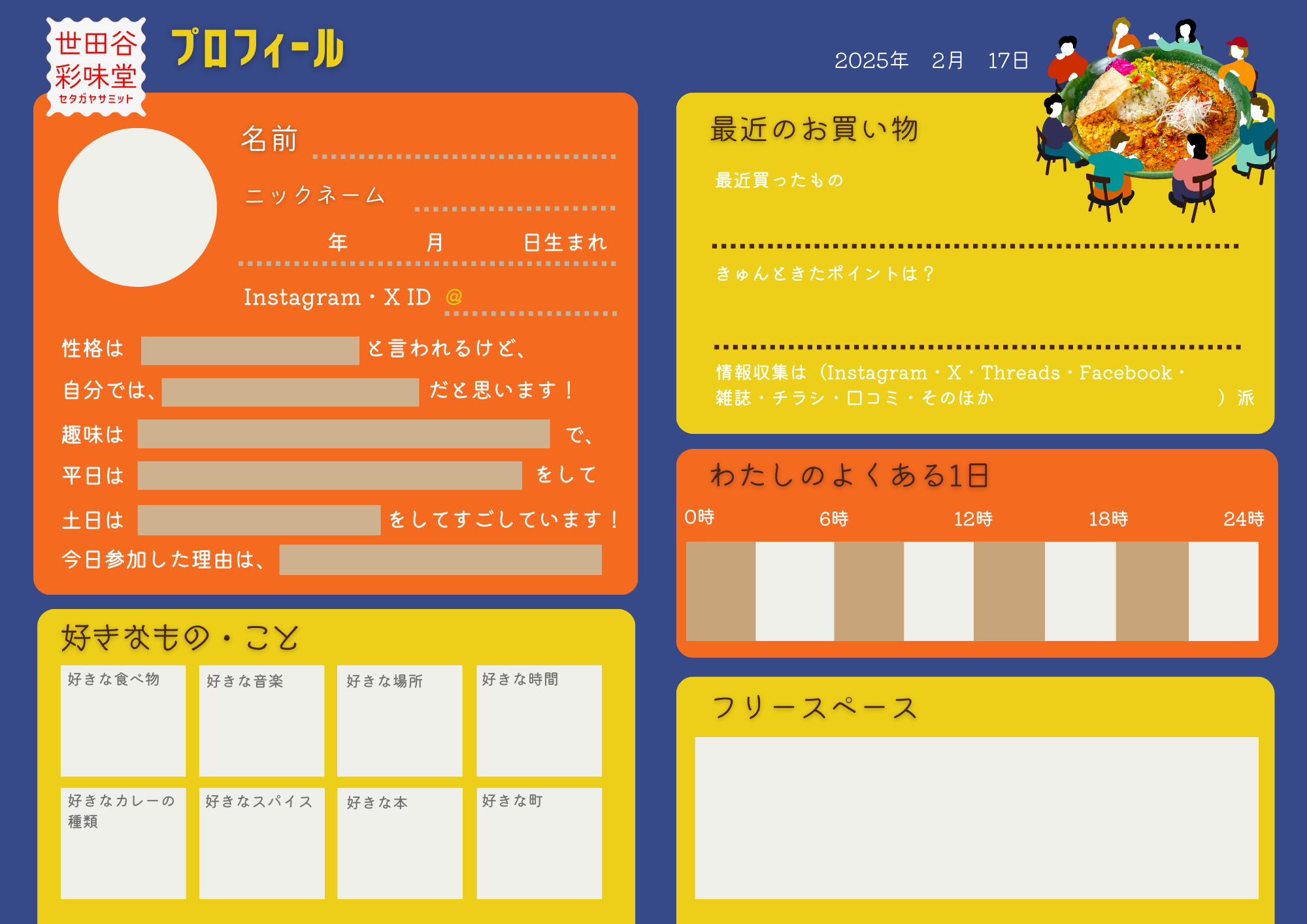 今回のターゲット層の皆さんには懐かしいプロフィール帳を「世田谷彩味堂」バージョンで用意したものに記入していただき、各グループで自己紹介を行いました。
